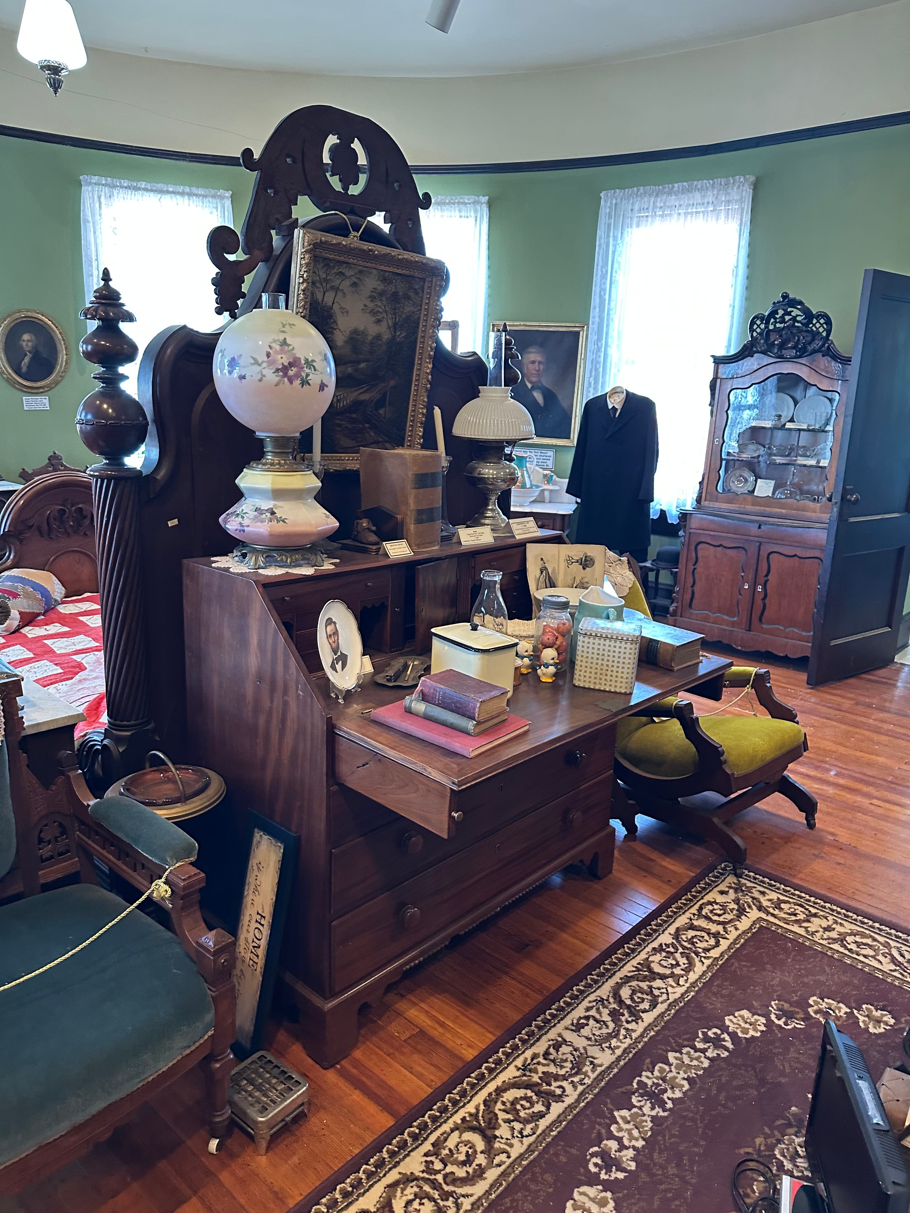 Recently, I took a small road trip to Adrian, a small town 45 minutes from Hillsdale, where I met up with my dear friend Grace (the same friend with whom I’m reading Anna Karenina). Little did we expect that our last stop would be the Lenawee County Historical Museum. We had just about settled on going where our fancies took us when a young tour guide named Em approached us. With her vintage sensibilities (and vintage name), big smile, and enthusiasm for the history of the area, we promptly took her up on her offer to show us around. Em is only a high schooler, but she could easily pass as a college student with her maturity and expertise. We had an entertaining and enlightening tour that even involved time in the spotlight (she turned on the stage lights in the auditorium attached to "The Victorian Room”- the photo above was taken in it- and had us pose for a photo)!